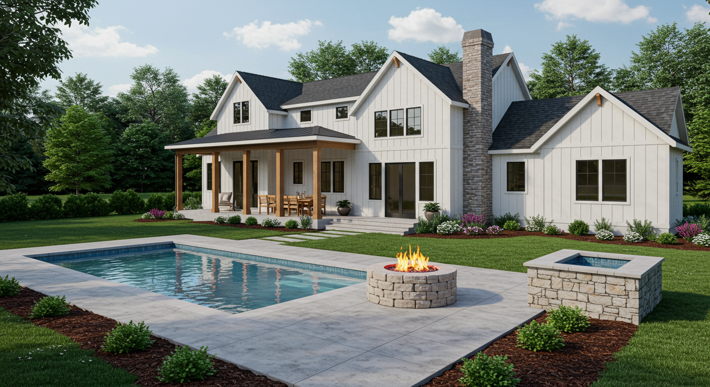 Summers at this new build will be enjoyed around the in-ground pool, outdoor kitchen, fire pit, and year-round hot tub! There is even an outdoor shower!