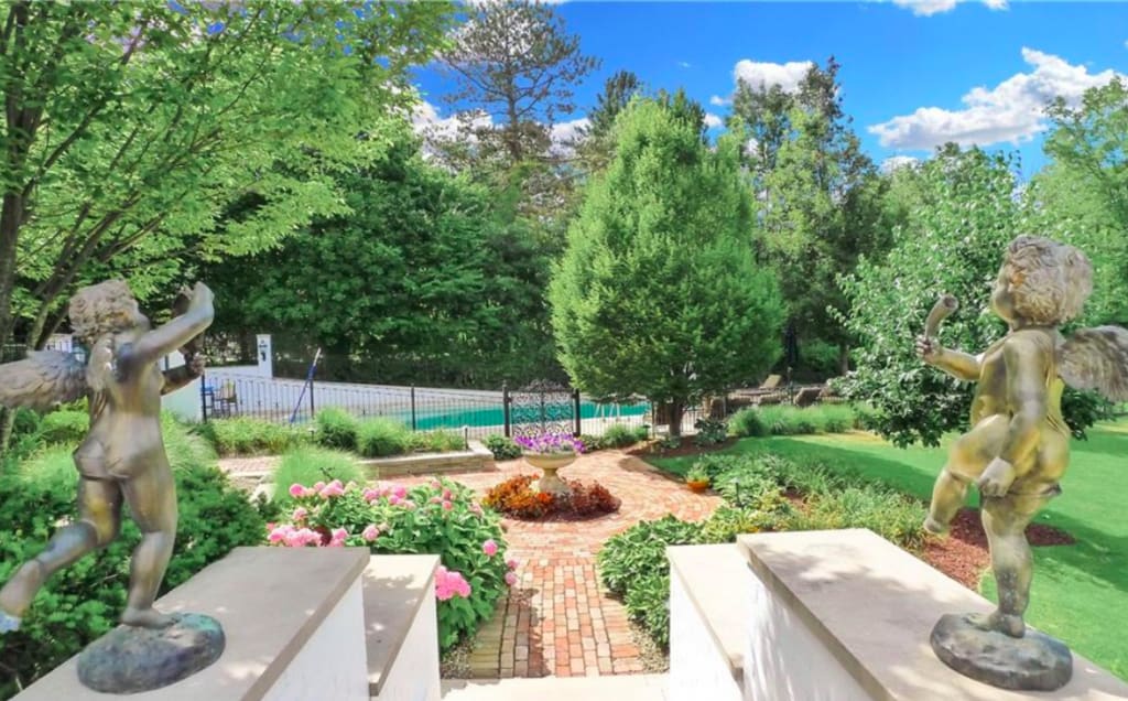 This home features an in-ground pool, a full outdoor kitchen or bar area, a covered veranda with a stone fireplace, and the most exquisite landscaping imaginable.